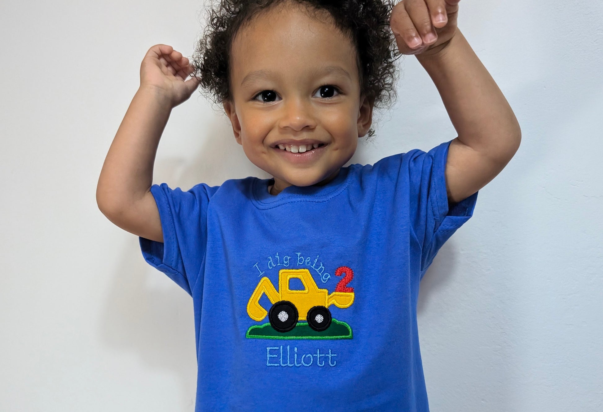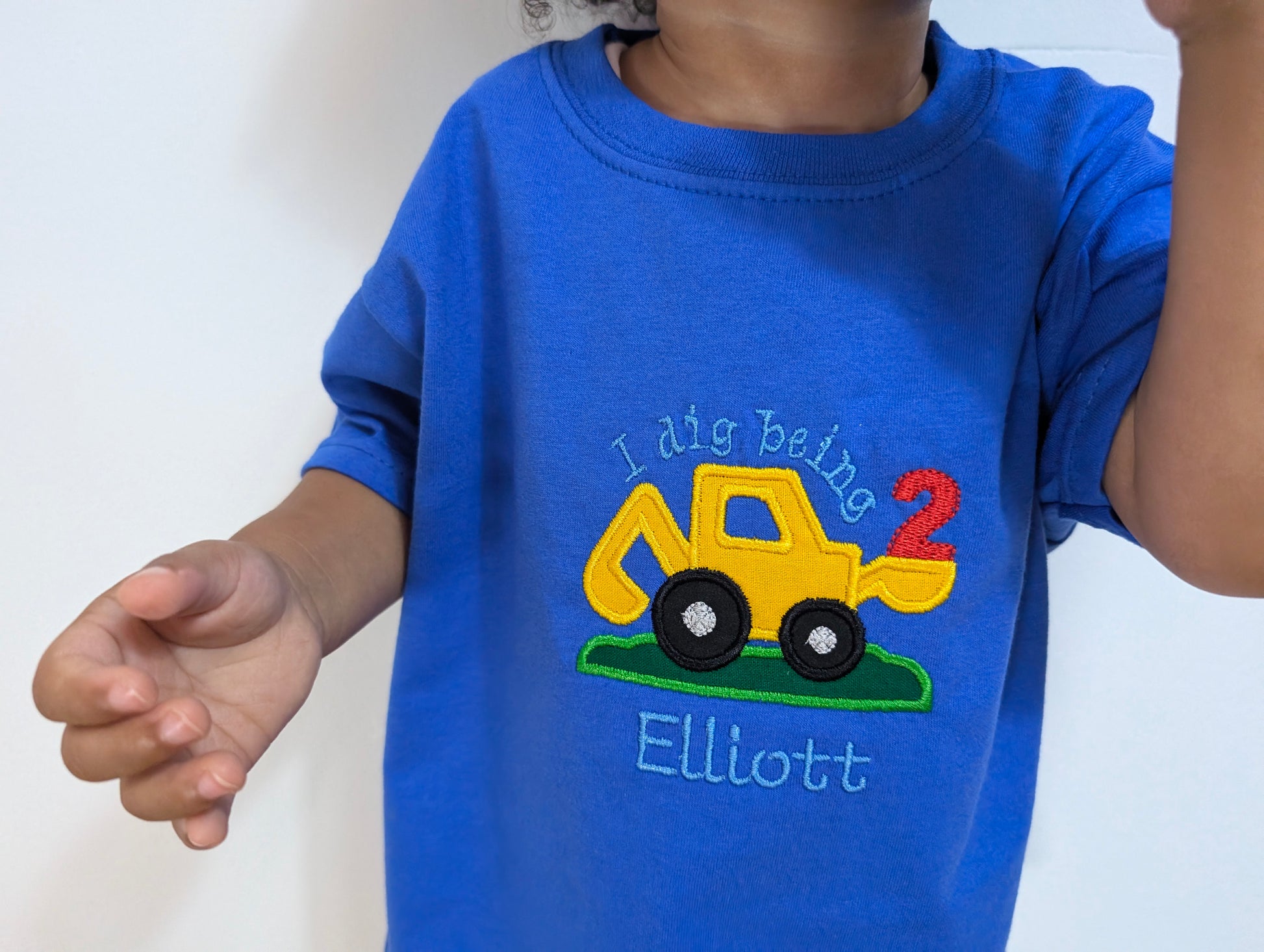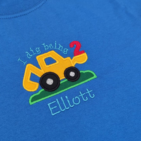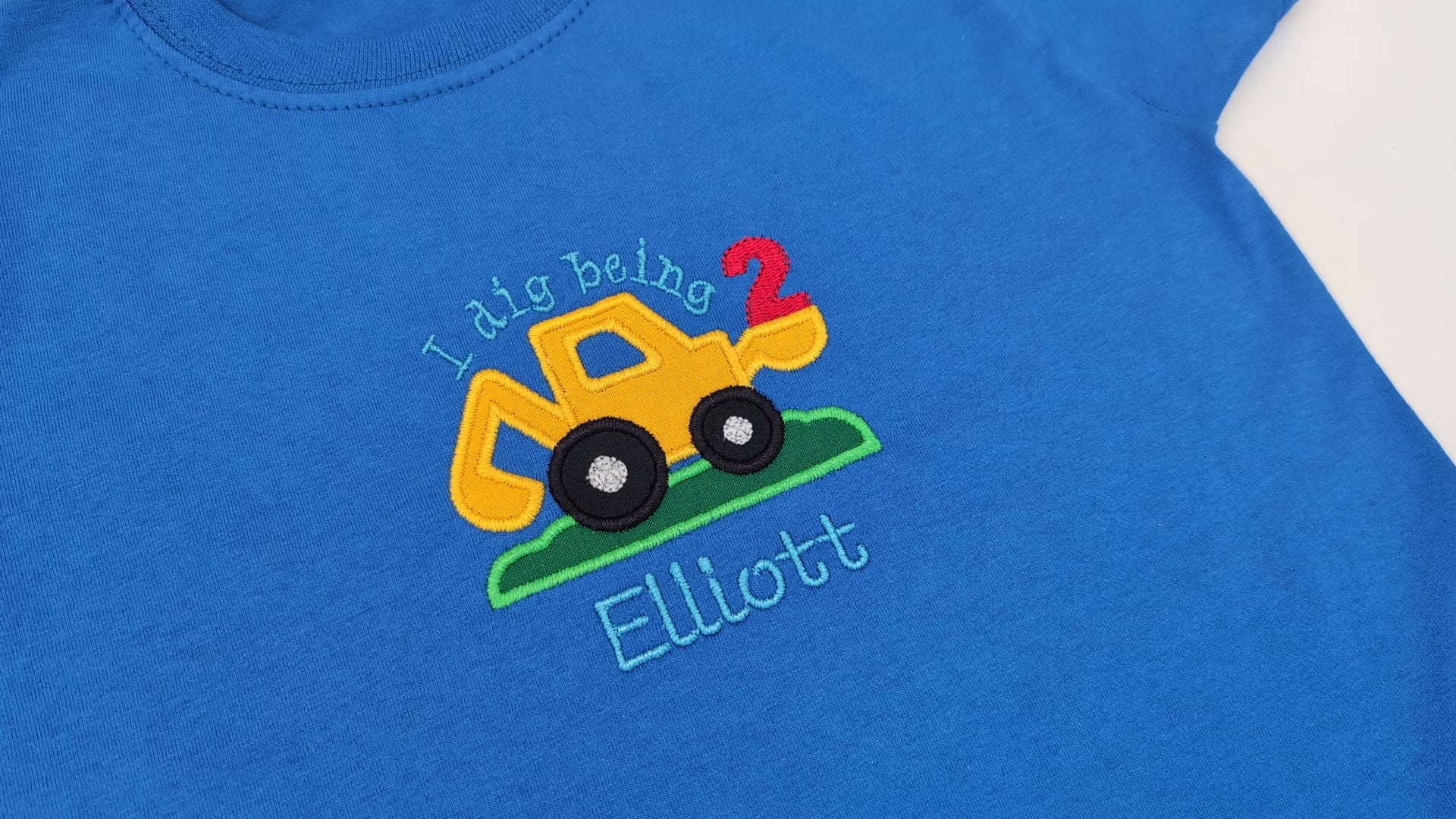 The iconic yellow digger truck design is now personalised and available in a range of T-shirt colours.